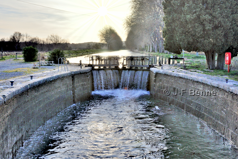 Voilà un bout de temps que je ne photographie plus les plaques (ou tout au moins que je ne les publie pas). Néanmoins, celle-ci mérite d'être montrée, car en aval, nous sommes sur le grand bief : 53,868 km jusqu'aux écluses de Fonsérannes. À partir de cet endroit, le canal du Midi va tracer de longues et nombreuses boucles qui suivent les courbes de niveau, parfois en remblais, parfois en déblais. C'est l'une des curiosités les plus intéressantes du Canal du Midi, et personnellement, c'est ce que j'aime le plus. Un régal pour les plaisanciers, pas d'écluse à franchir pendant presque 54 km ! Mais ce n'est pas une raison pour se dépêcher, nous avons tout le temps...