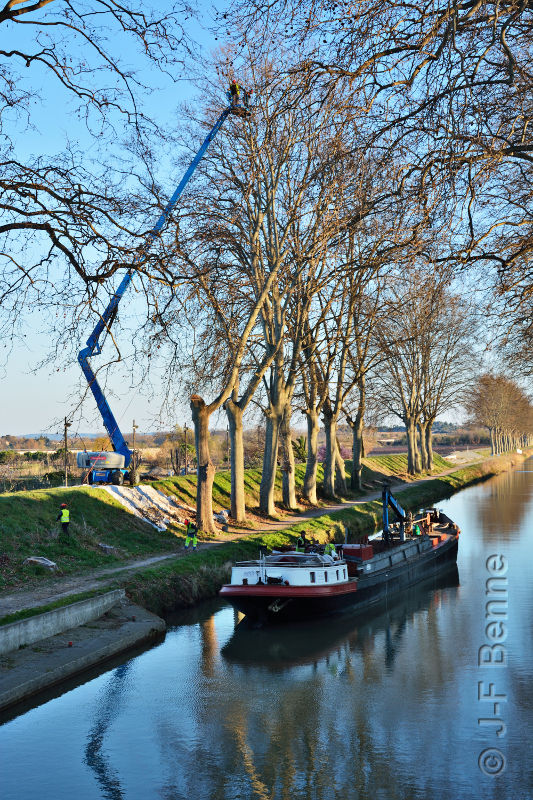 La tristesse du Canal du Midi, comme celle du canal de jonction : Ce jour là, c'était le 6 mars 2014, en fin d'après-midi, on abattait des plâtanes malades du chancre coloré, cette maladie qui nous est venue de nos libérateurs, les américains, lors du débarquement en provence. On ne va pas leur en vouloir, ils ne savaient pas, et en plus, ils sont venus nous libérer...