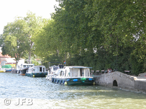 Quelques bateaux amarrés et un petit épanchoir, sur le Grand Bassin de Castelnaudary
