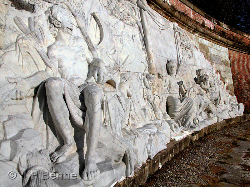 La photo du centre montre le bas relief réalisé par François Lucas, professeur à l'académie royale. Il représente la province de Languedoc, ordonnant au canal qui atteint la Garonne en aval de Toulouse, de recevoir à son tour les eaux du fleuve pour mieux communiquer avec la cité.
